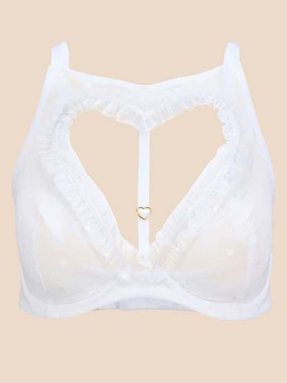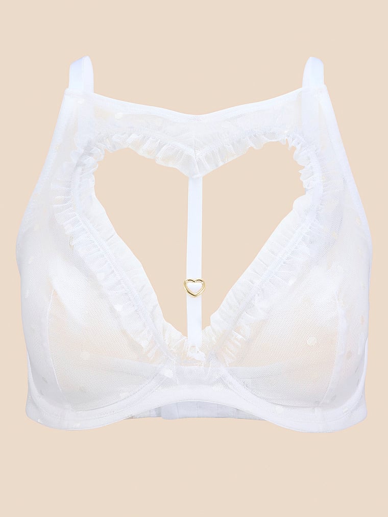 A high neck and open heart accent bring classic romance to this bra and panty set.
